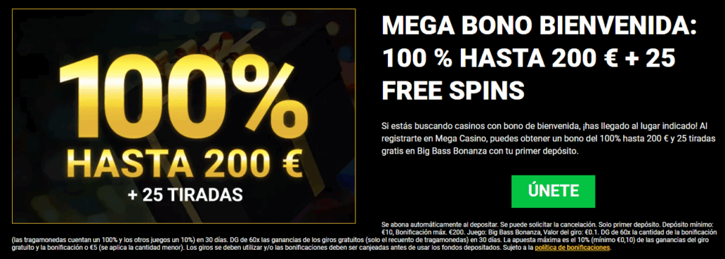 Además de los 10 giros gratis en la slot Big Bass Bonanza, MEGAcasino cuenta con un bono por depósito del 100% hasta 200€ + 25 tiradas gratis del que podrás beneficiarte, independientemente de si has disfrutado o no del bono sin depósito.