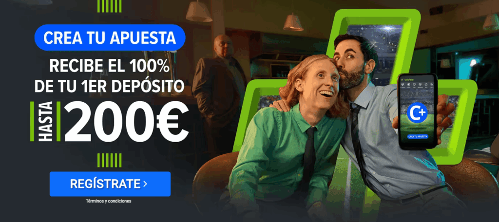 Codere ofrece hasta 200€, RETAbet cuenta con una apuesta segura de bienvenida y 888sport regala 10€ por registro más un bono del 100% hasta 100€. Cada bono tiene condiciones específicas de depósito y cuota mínima.